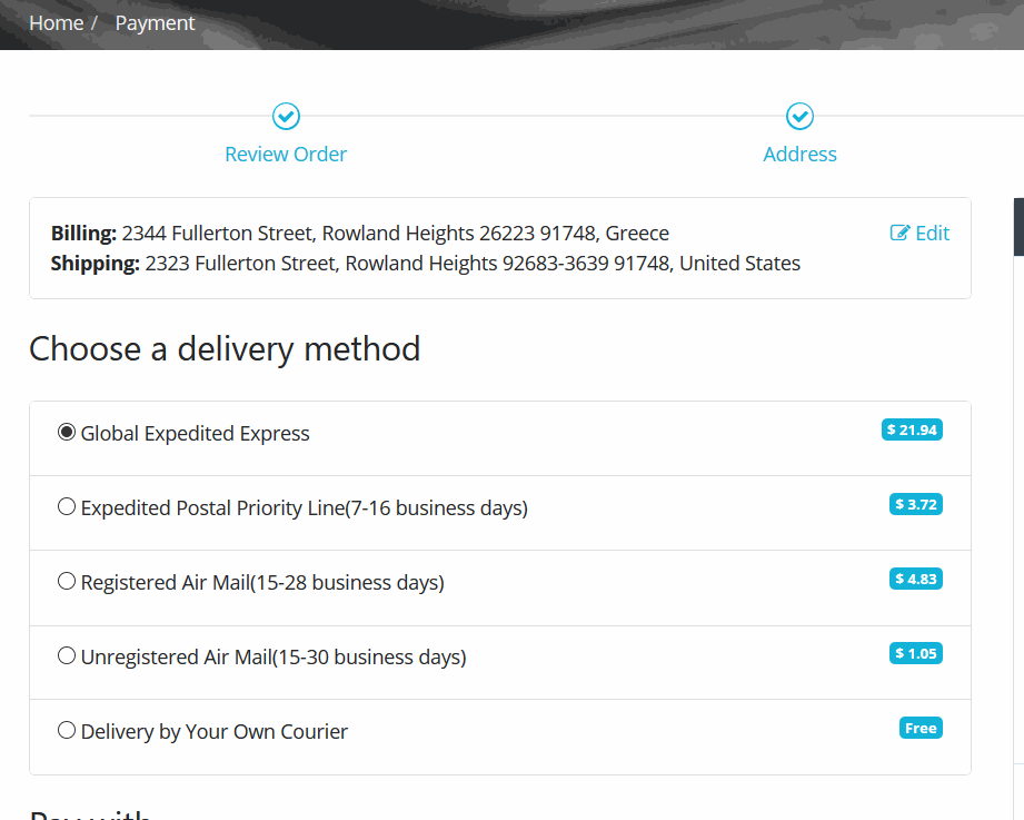 We have 5 different shipping methods: unregistered, registered, priority line, expedited shipping and your own Courier.